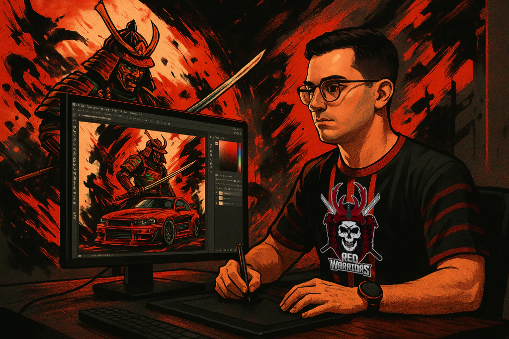 Na Red Warriors, transformamos qualquer ideia em arte profissional. Criamos desde artes para estamparia até logotipos, adesivos, ilustrações automotivas, identidade visual, banners, mockups e muito mais — tudo com a estética forte, marcante e exclusiva da nossa marca.